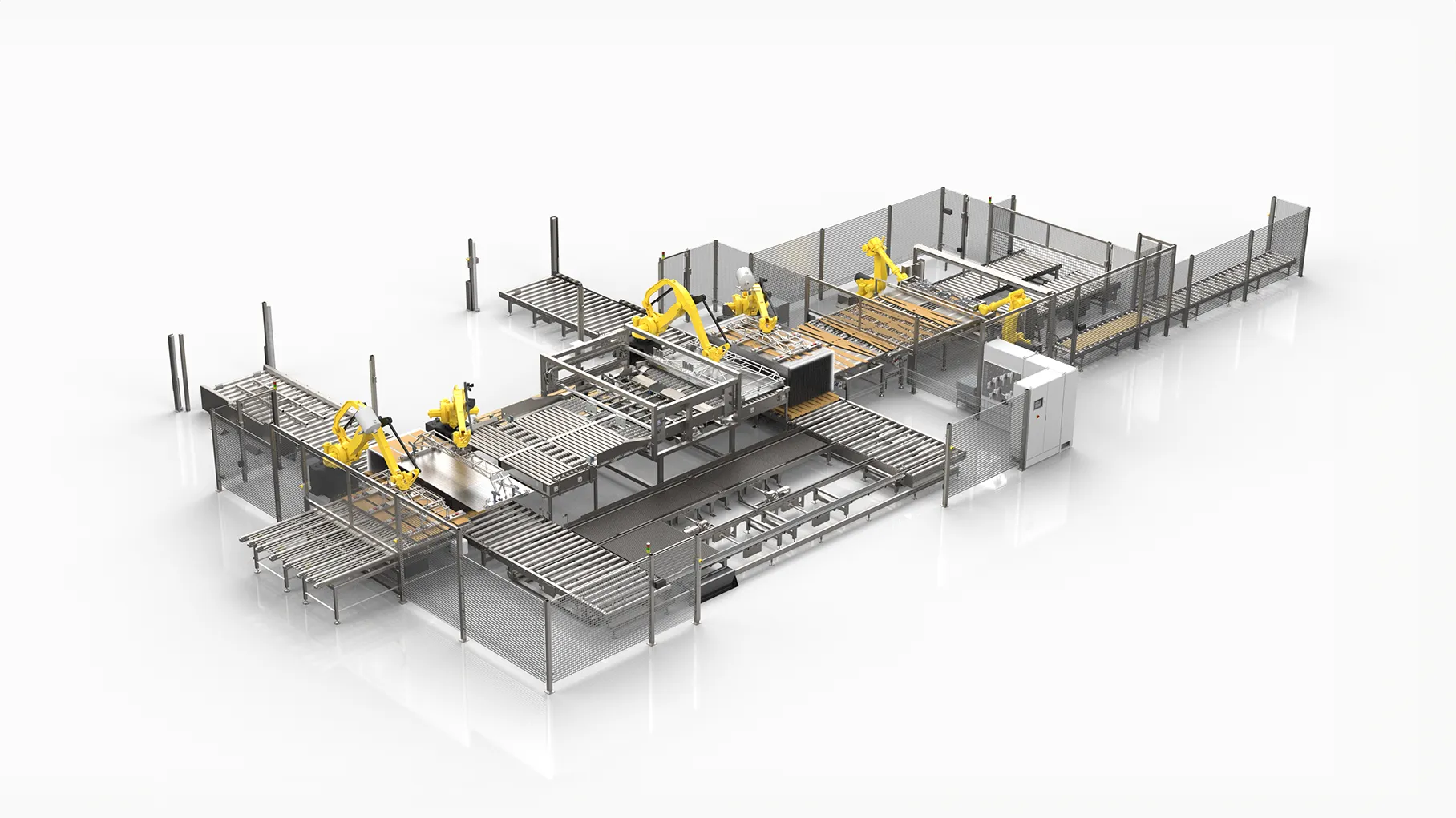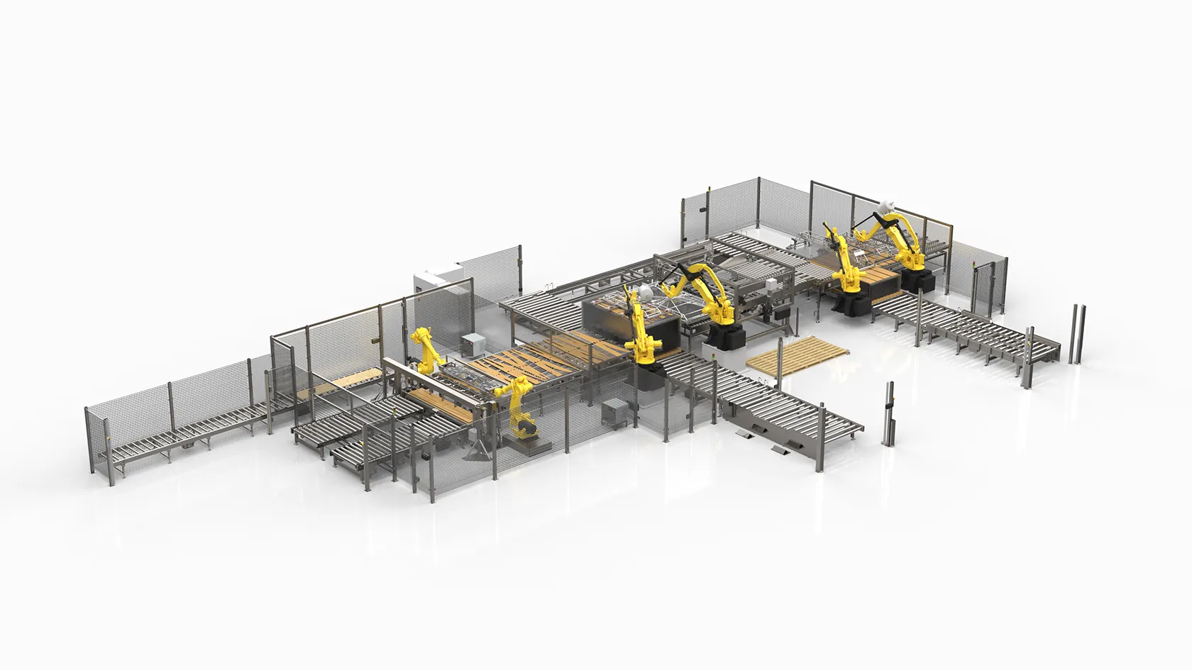 Die Furniere werden nun in die Palettierzelle verfahren und auf der Rollenbahn zu 3 – 4 Stück gruppiert. Zwei Roboter legen nun abwechselnd Furniere und Aluminiumgitter auf eine Schwerlastpalette. Die gefüllte Palette wird ausgeschleust und vom Gabelstapler entnommen.