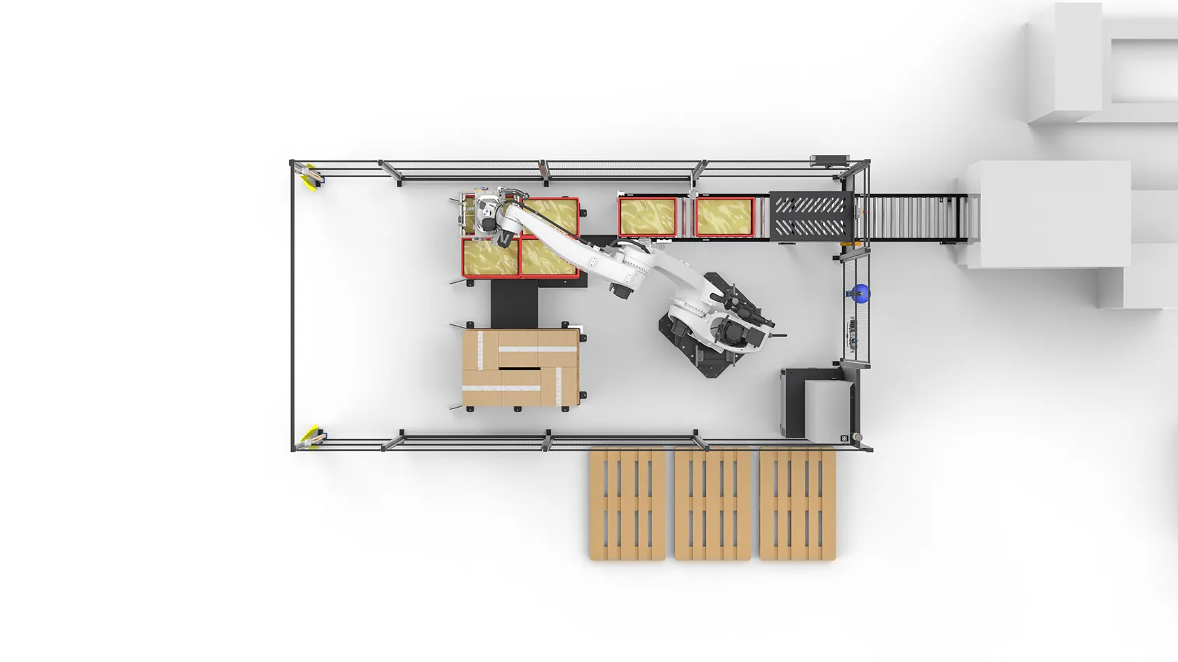 Die Kisten oder Kartons werden von Hand verpackt und der Anlage über die Rollenbahn zugeführt. Am Endpunkt greift der Roboter die Kisten/Kartons und legt sie nach Packschema auf einem der beiden Palettenstellplätze ab.