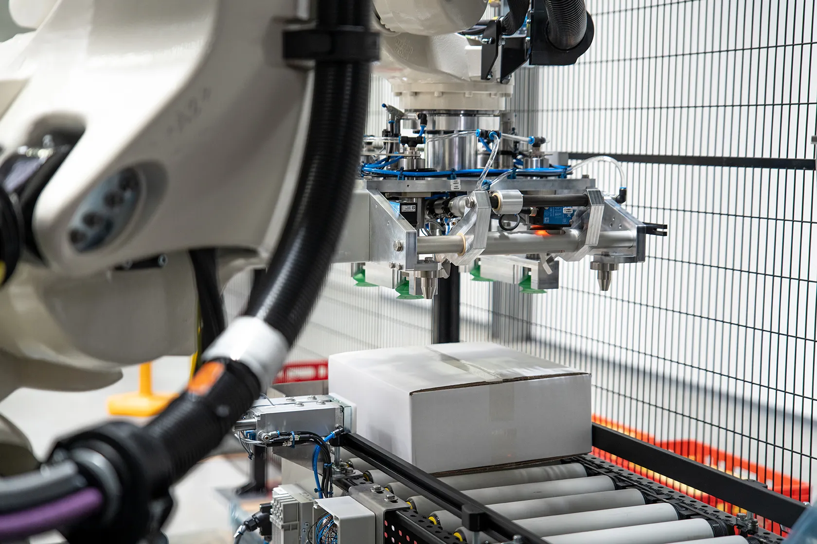 Die Kisten oder Kartons werden von Hand verpackt und der Anlage über die Rollenbahn zugeführt. Am Endpunkt greift der Roboter die Kisten/Kartons und legt sie nach Packschema auf einem der beiden Palettenstellplätze ab.