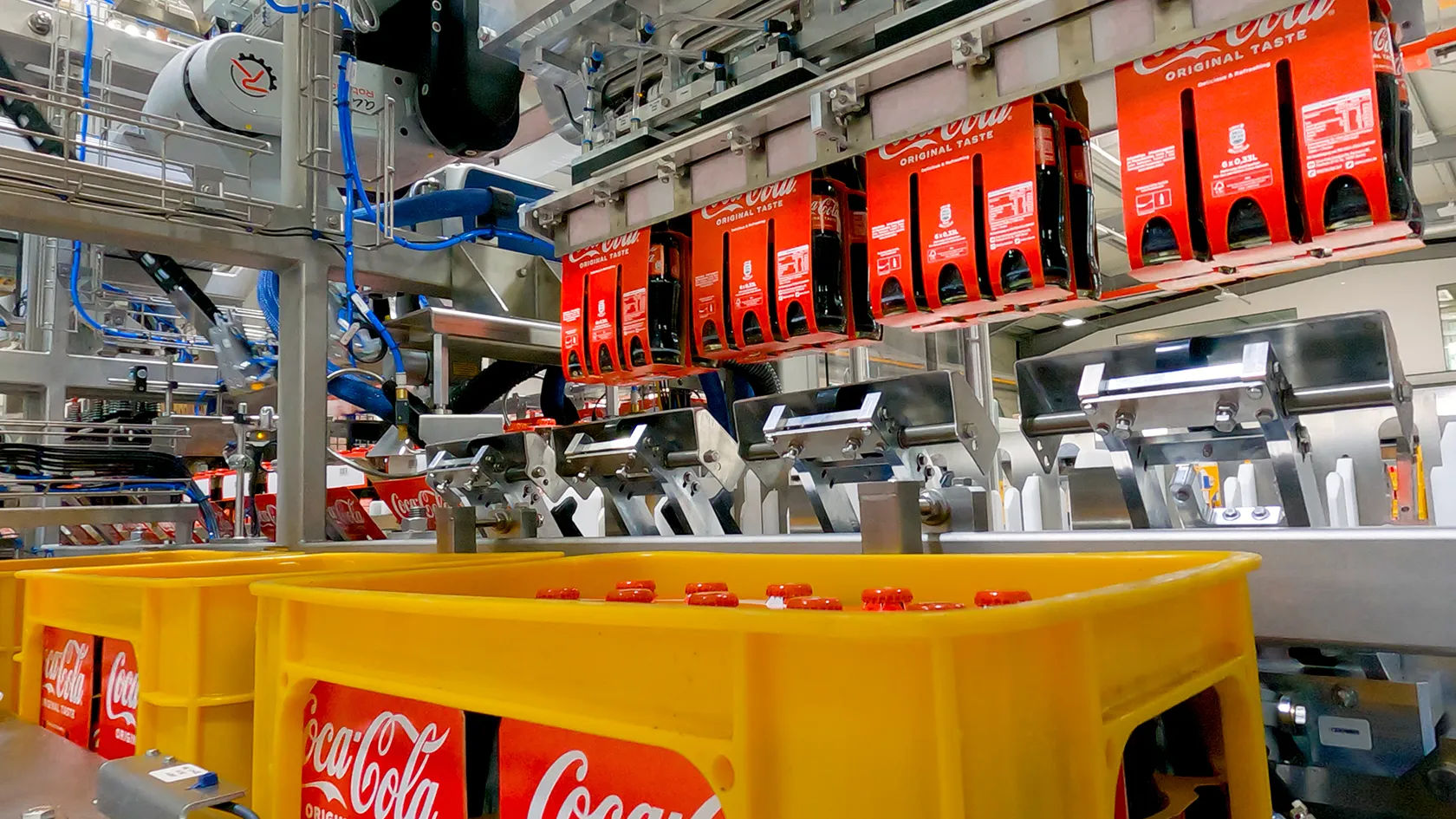 Bei diesem Projekt wurde die Kartonierung von Glasflaschen zu Six-Packs und die anschließende Verpackung in Getränkekisten realisiert.