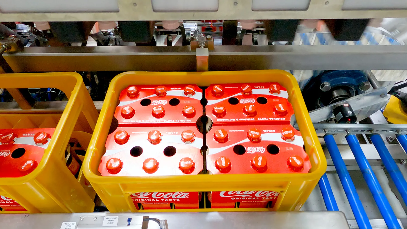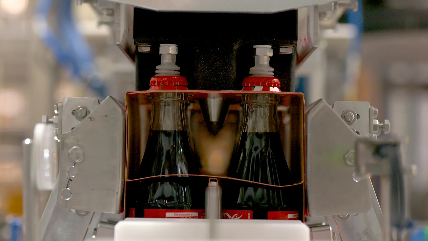 Auf die unverschlossenen Six-Packs werden nun die Karton-Clips aufgesteckt und mit den Außenkartons verklebt. Die fertigen Gebinde werden automatisch zurück in den Kasten gehoben und ausgeschleust.
