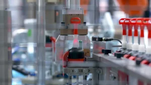 Filled cans are fed to the system in a single row. At the end position, the assembly robot removes the cans and places them in the assembly unit. At the same time, caps are fed from a bunker and placed on the can, after which they are pressed on.