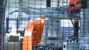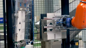 After each complete layer, the robot also removes a slip sheet and positions it on the pallet.