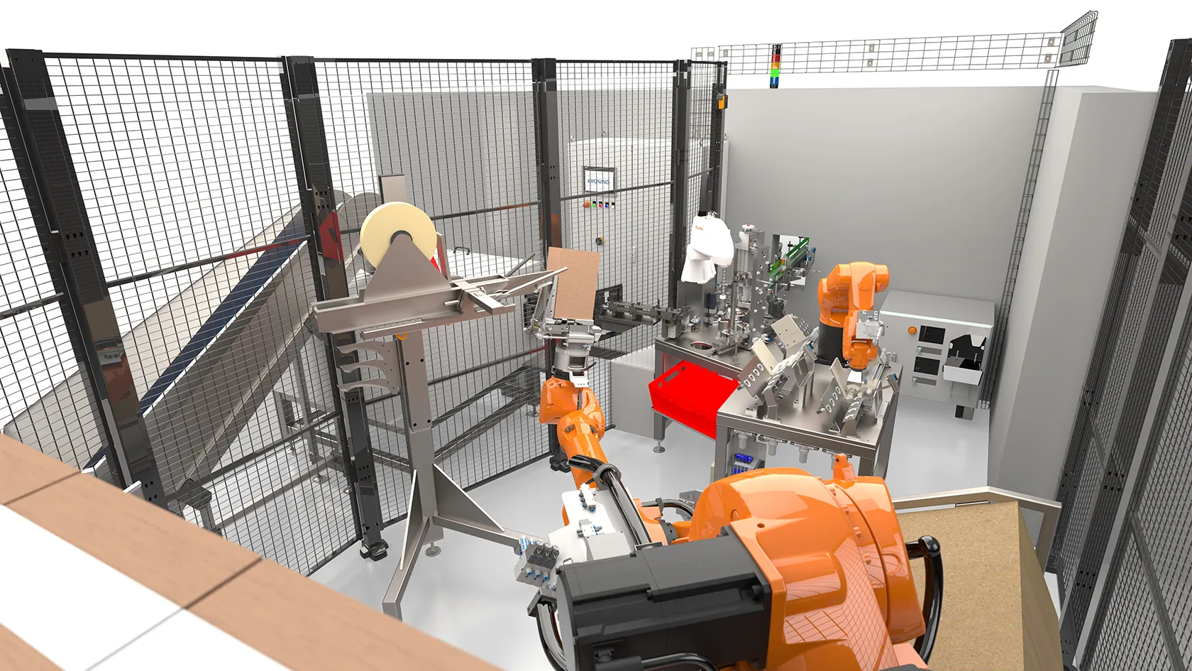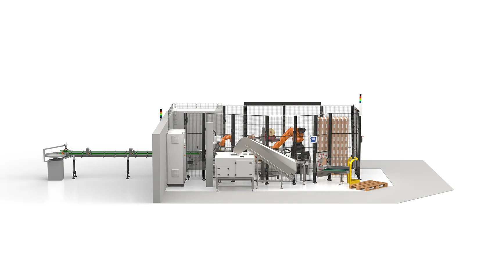 After the can has been removed from the assembly unit, it is taken by the robot and placed in front of a box. Depending on the format, a stack of 6 to 12 cans is formed here and pushed into the box. The palletizing robot removes the filled box, pulls it through the gluing unit and places it on a pallet according to the packing pattern.