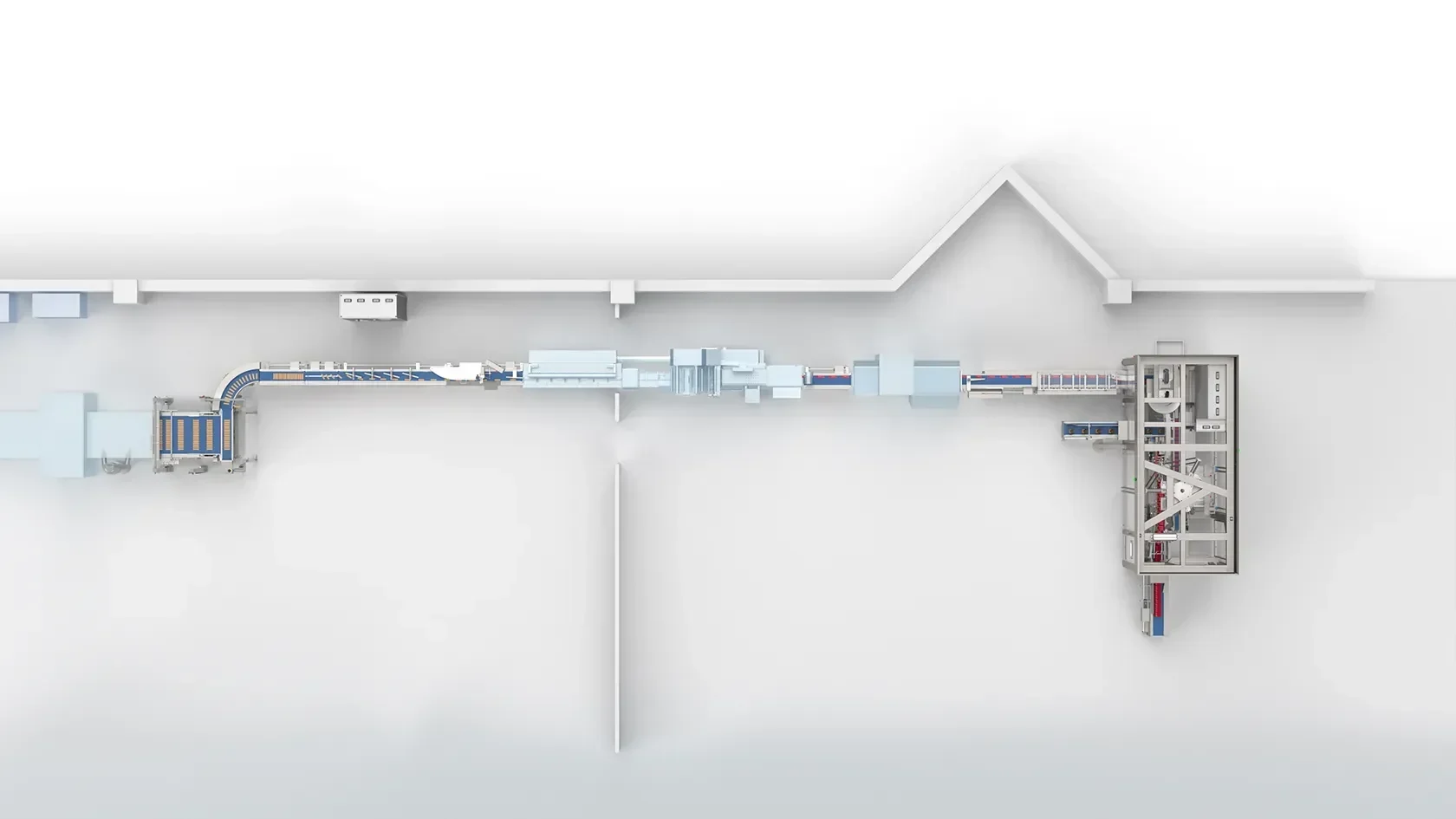 If there are faults in the downstream systems or when the system is being emptied, the products can be discharged here. Fault-free bars are transferred to the curved belt and fed to the form-fill-seal machine via a pre-twisting belt and several chicanes.
