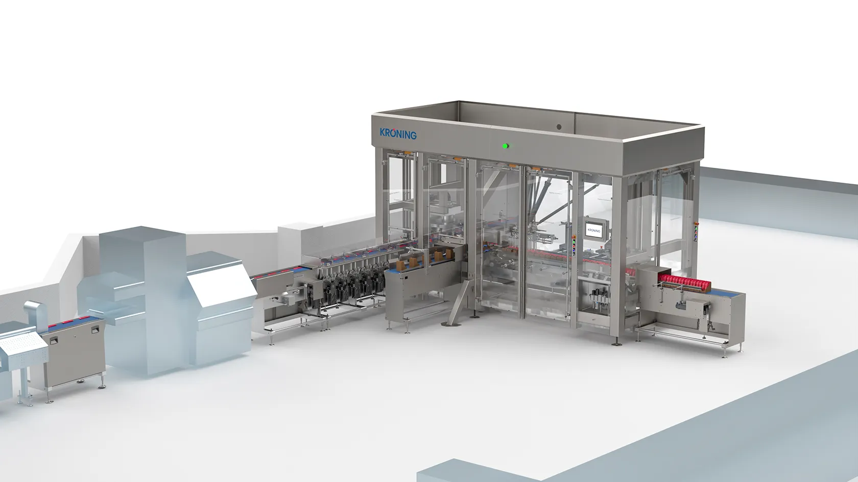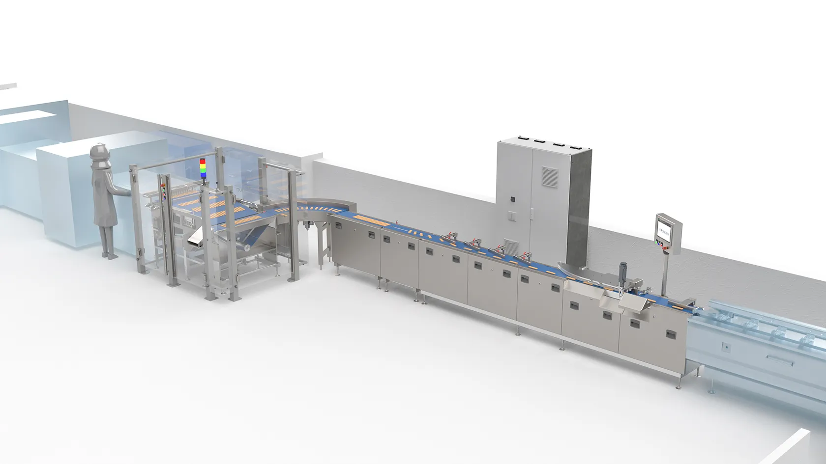 If there are faults in the downstream systems or when the system is being emptied, the products can be discharged here. Fault-free bars are transferred to the curved belt and fed to the form-fill-seal machine via a pre-twisting belt and several chicanes.