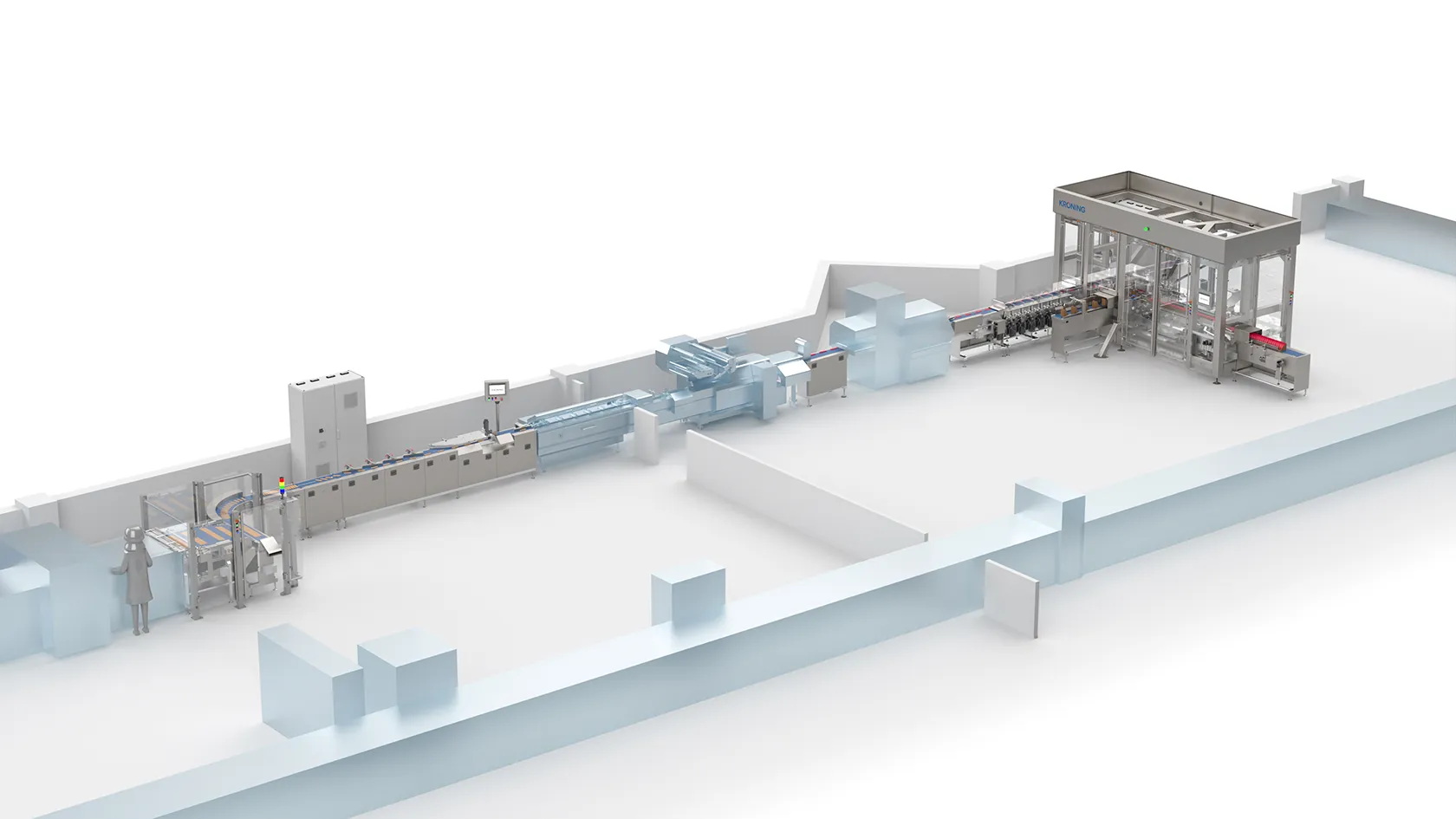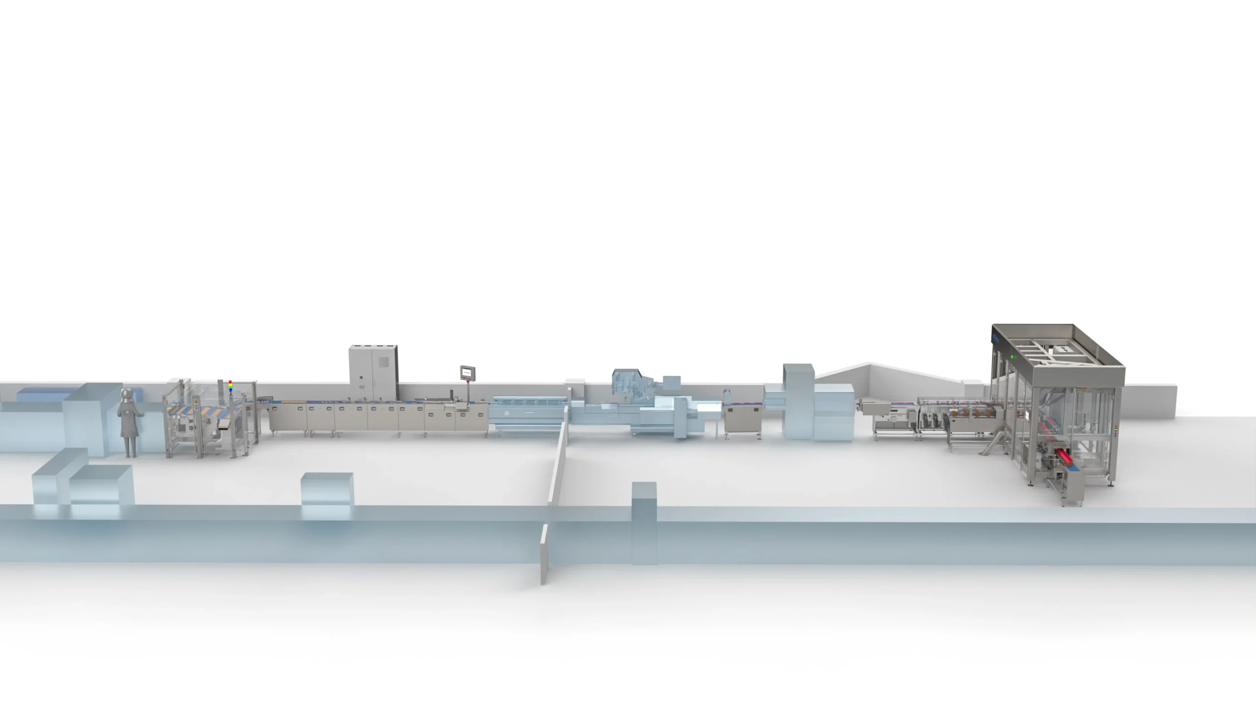 At the end of the box conveyor, the filled boxes are removed by an operator.