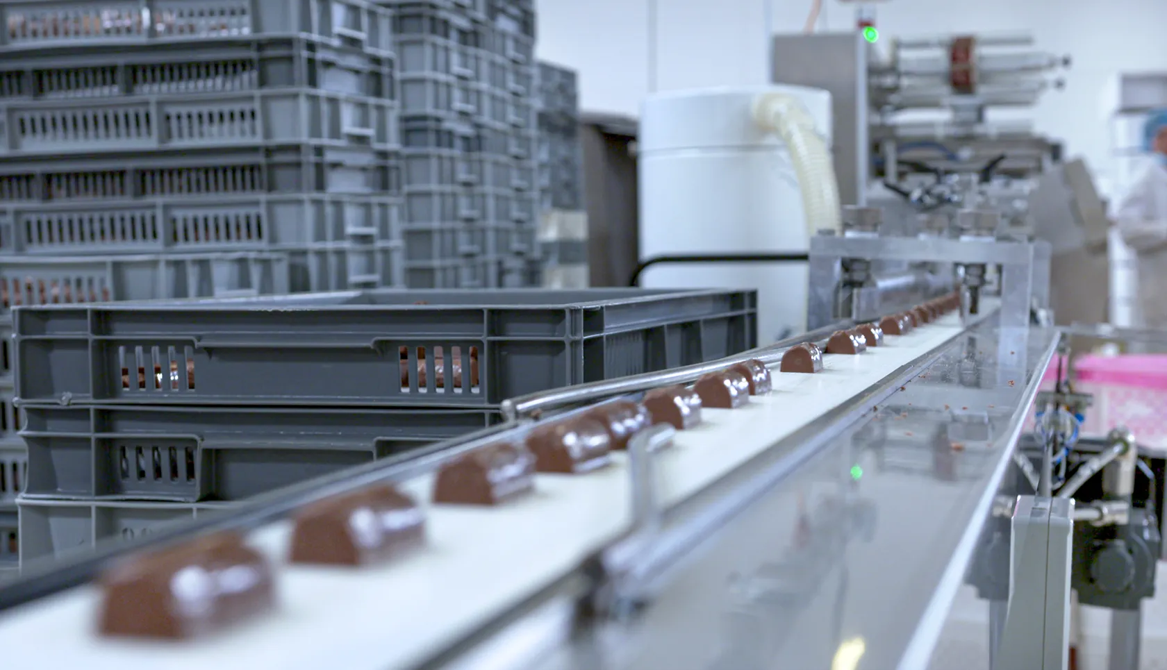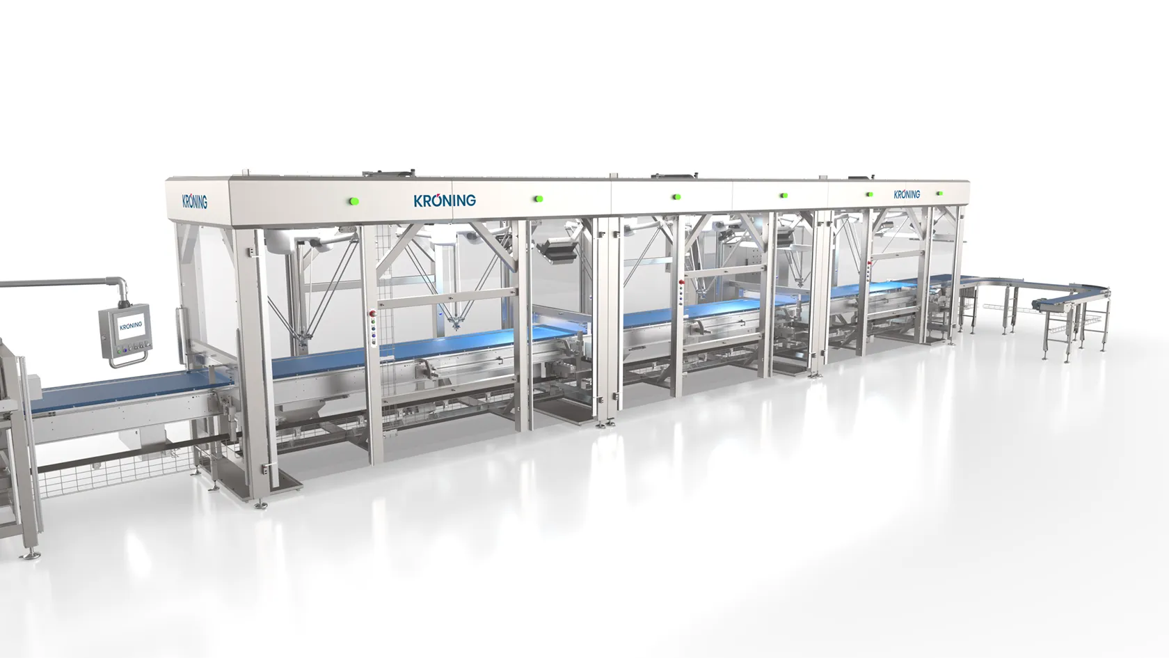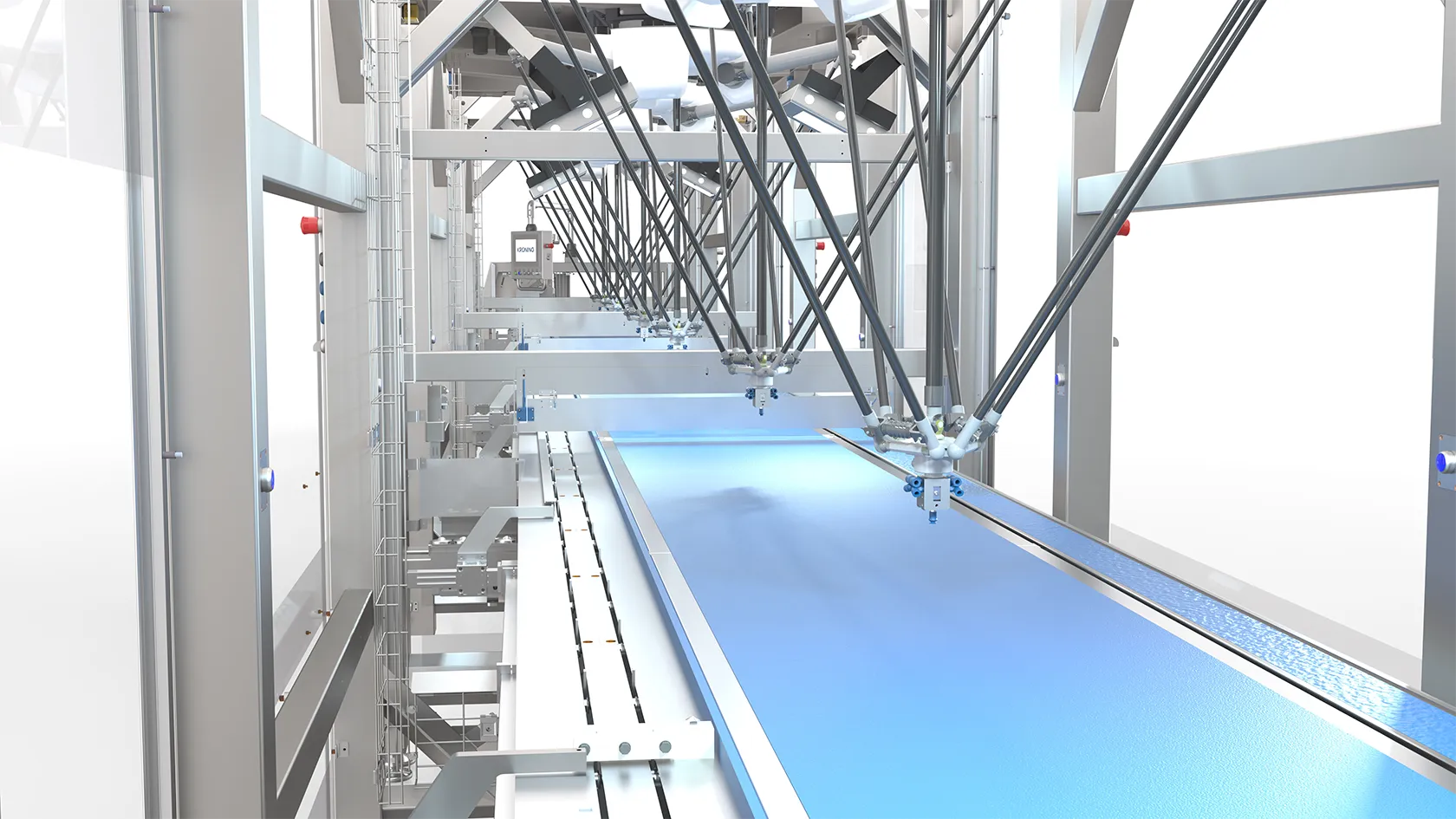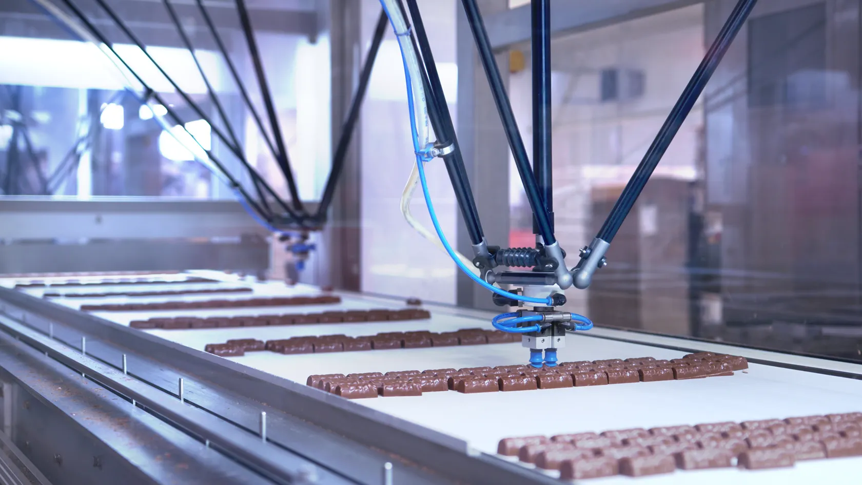 The nougat chocolates are fed into the system in rows on a conveyor belt and pass through three picker cells, each with two delta robots. Each cell has its own camera unit. The chocolates are picked individually by the robot and placed either on the flowpack belt or in blisters. The flowpack machine is fed in parallel in the same direction, while the blister chain is fed in parallel in the opposite direction. Once the nougat chocolates have passed the robot cells, they are centered and fed to the flow-wrapping machine. Articles that are not picked continue on the feed belt and are collected in boxes at the end.