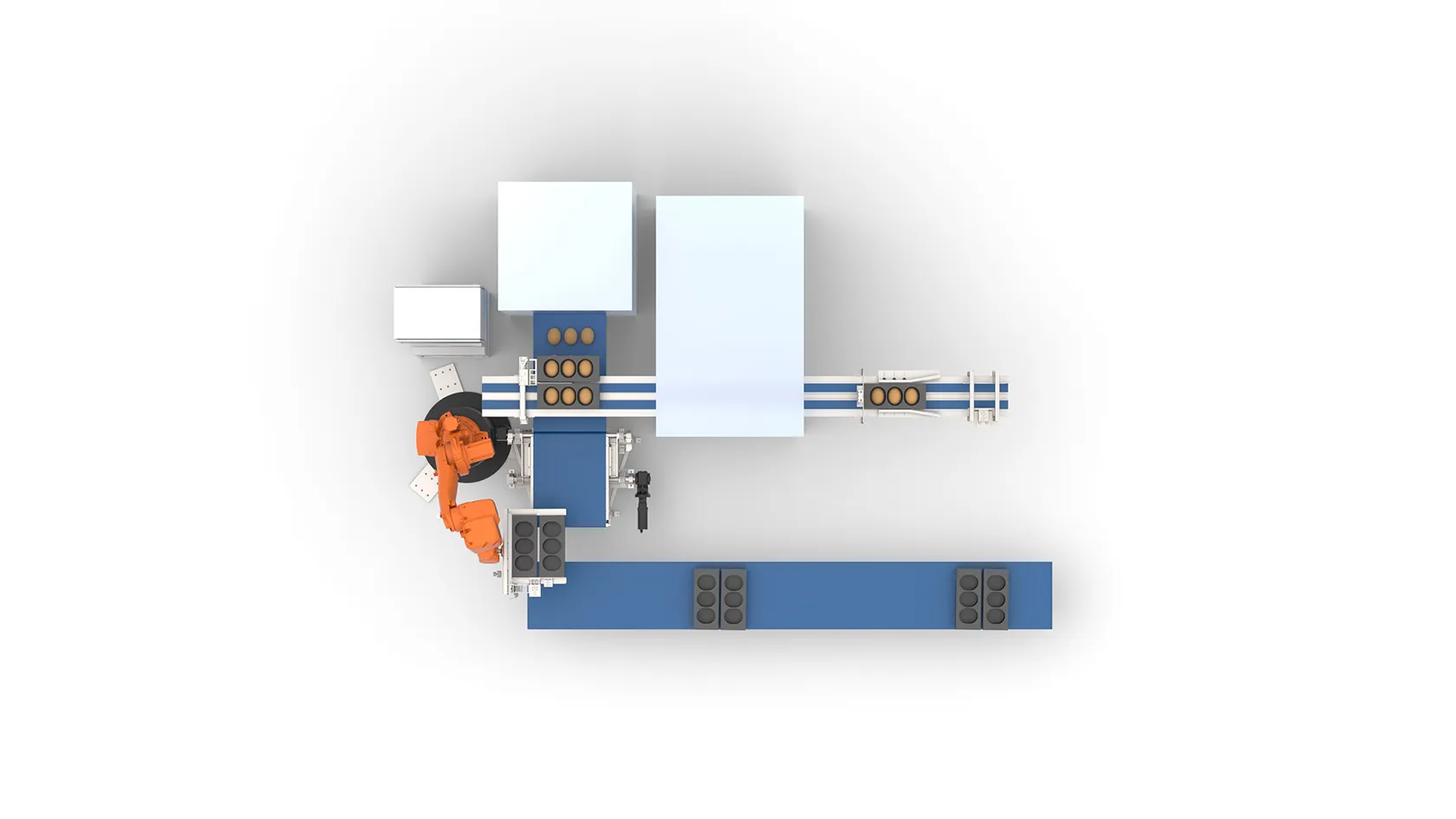 The filled baking tins are fed to the robot cell on a chain conveyor and fixed in place at the removal point. The baking tin unit, which consists of 2x 6 cake tins, is removed by the robot and pushed upright onto a belt conveyor.