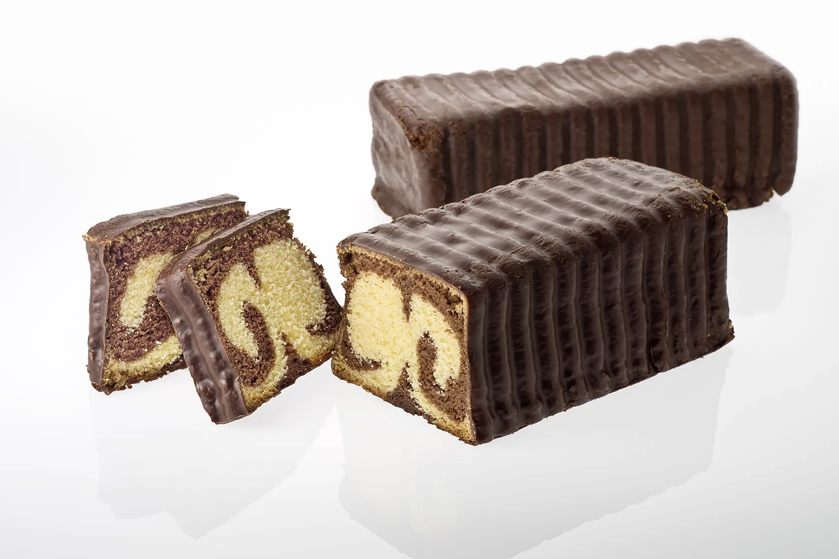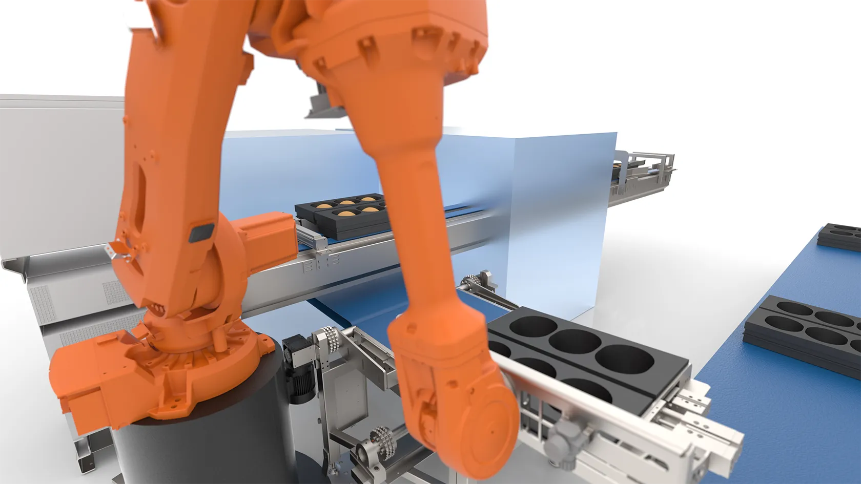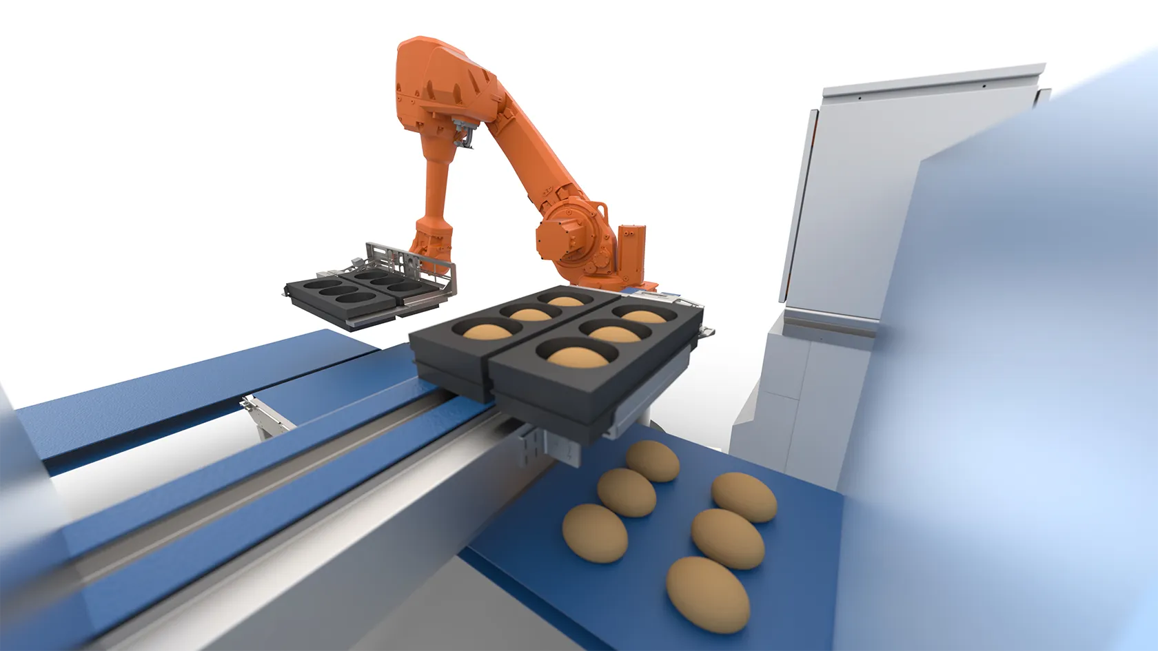 The belt is folded down, the robot performs this movement as well, and then lifts the baking pan off the cakes. These are transferred to a chain conveyor and discharged from the system. The robot places the baking pan on a separate belt, and it is fed back into the baking process.