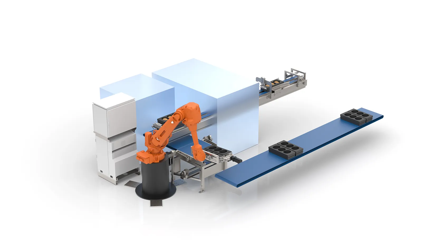 The filled baking tins are fed to the robot cell on a chain conveyor and fixed in place at the removal point. The baking tin unit, which consists of 2x 6 cake tins, is removed by the robot and pushed upright onto a belt conveyor.